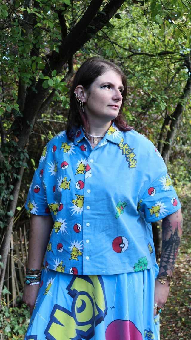 Pièce artisanale unique réalisée dans mon atelier à partir d’un ancien drap Pokémon recyclé, cette chemise allie style rétro, confort et engagement écologique.