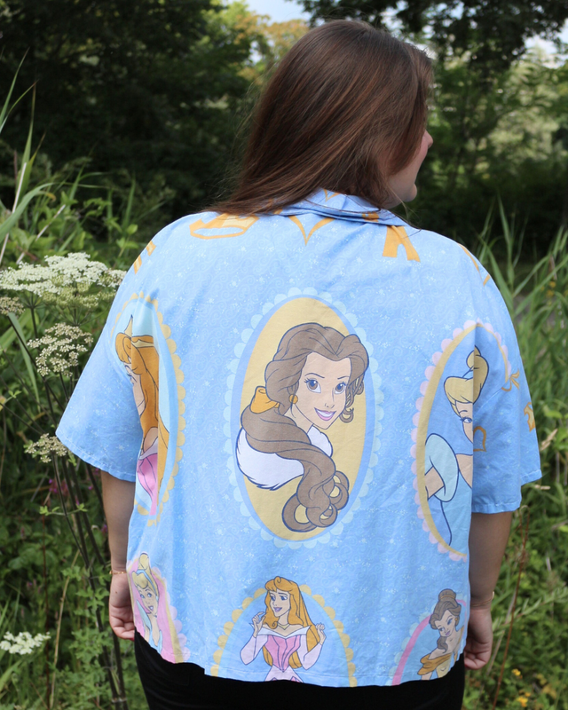 Cette chemise à manches courtes est une pièce d'une douceur infinie, conçue à la main dans mon atelier à partir de textiles vintage soigneusement revalorisés. Avec ses portraits délicats des héroïnes les plus iconiques de Disney, elle est l'alliée parfaite pour un look romantique, éthique et empreint de magie.