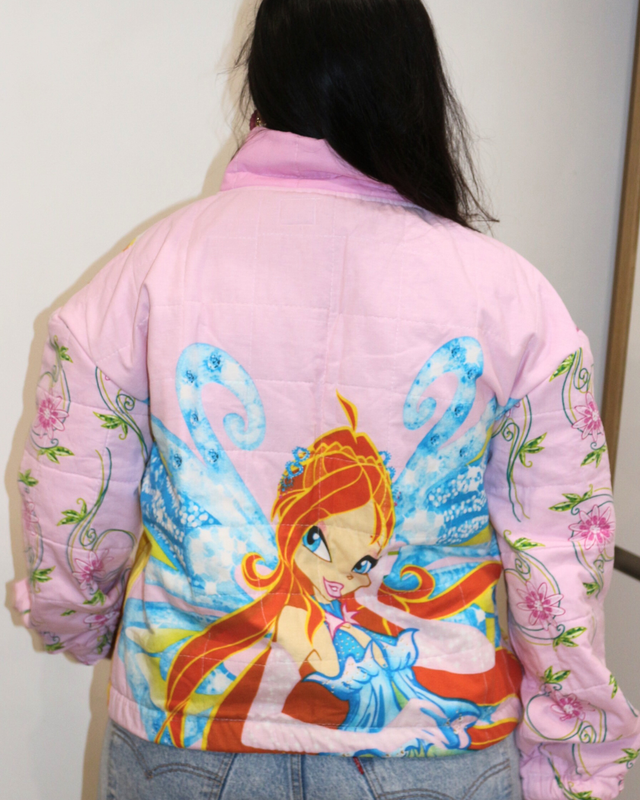 Cette veste a été réalisée dans mon atelier pour devenir une pièce unique, inspirée de l’univers magique des Winx Enchantix. Elle célèbre la féerie, les couleurs et la nostalgie à travers une création lumineuse et enchantée, pensée comme un vêtement fort et original. 🧚♀️✨
