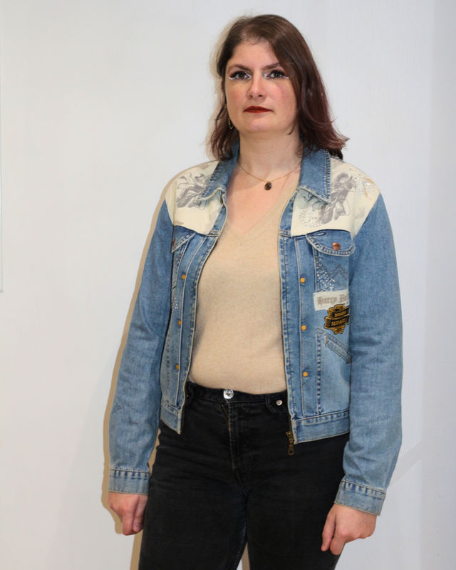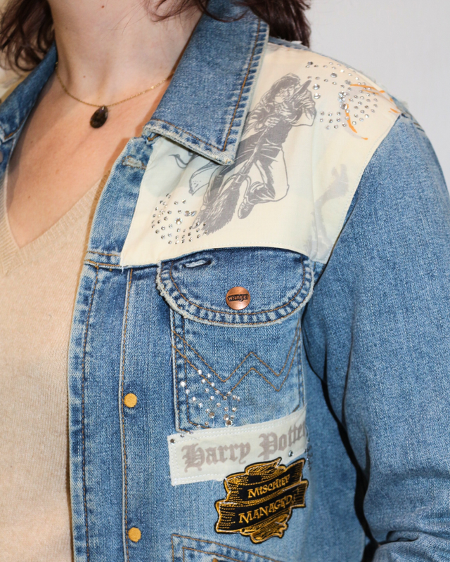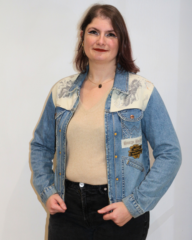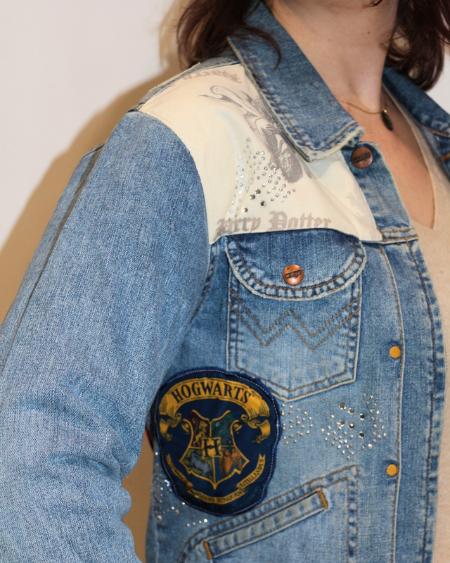 Cette veste iconique a été entièrement réinventée dans mon atelier pour devenir une œuvre textile unique. Alliant le denim vintage à l’univers de Harry Potter, elle est le fruit d’un travail artisanal minutieux.