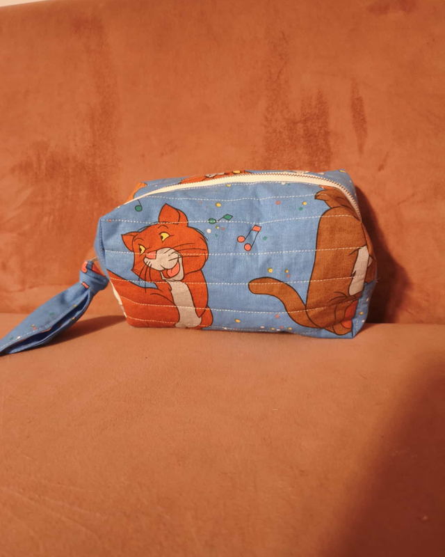 Cette trousse matelassée a été réalisée entièrement à la main dans mon atelier, à partir d’un tissu recyclé soigneusement chiné. Son motif rend hommage à l’univers tendre et élégant des Aristochats, mêlant douceur, charme parisien et notes vintage.